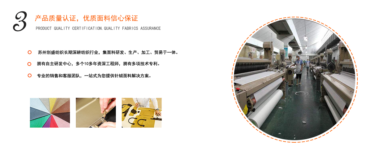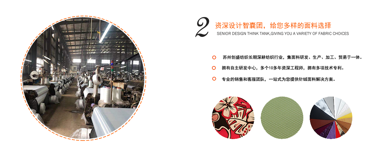 蘇州創(chuàng)盛紡織有限公司坐落于江蘇省吳江市盛澤鎮圣塘村,自2004年成立以來,一直致力于中高檔功能型環(huán)保梭織面料的研發(fā)與經營,創(chuàng)盛紡織在專注幾十年面料經營中,不斷的完善管理,嚴格的把控品質,精準的創(chuàng)新產品,從而讓每一款面料滿足不同客戶的個性化需求,產品廣泛適用于:嬰兒用品、戶外旅行用品、運動休閑用品、箱包手袋、家庭收納用品等領域。